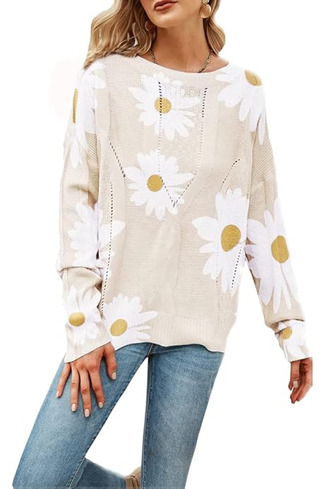 Womens Cute Daisy Knitted Sweater Oversized Long Sleeve Round Neck Loose Pullover Knitwear Black At Amazon Women S Clothing Store